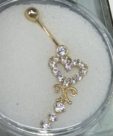 14K Belly Piercing Round Bezel with Dangling Open Heart with Tail and CZ