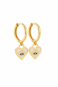 14K Huggies Plain with Dangling Enamel Heart Protective Eye Stamp