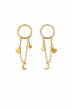 14K Gold Huggies with Hanging Chains, Star, Moon and Heart