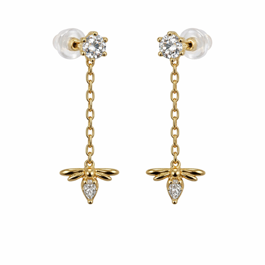 14K Push Back Round CZ With Dangling Dragon-Fly